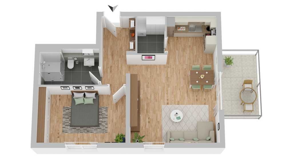 • Die Nass- und Wohnräume werden mit hochwertigen Fliesen und Vinylboden nach Wahl ausgestattet