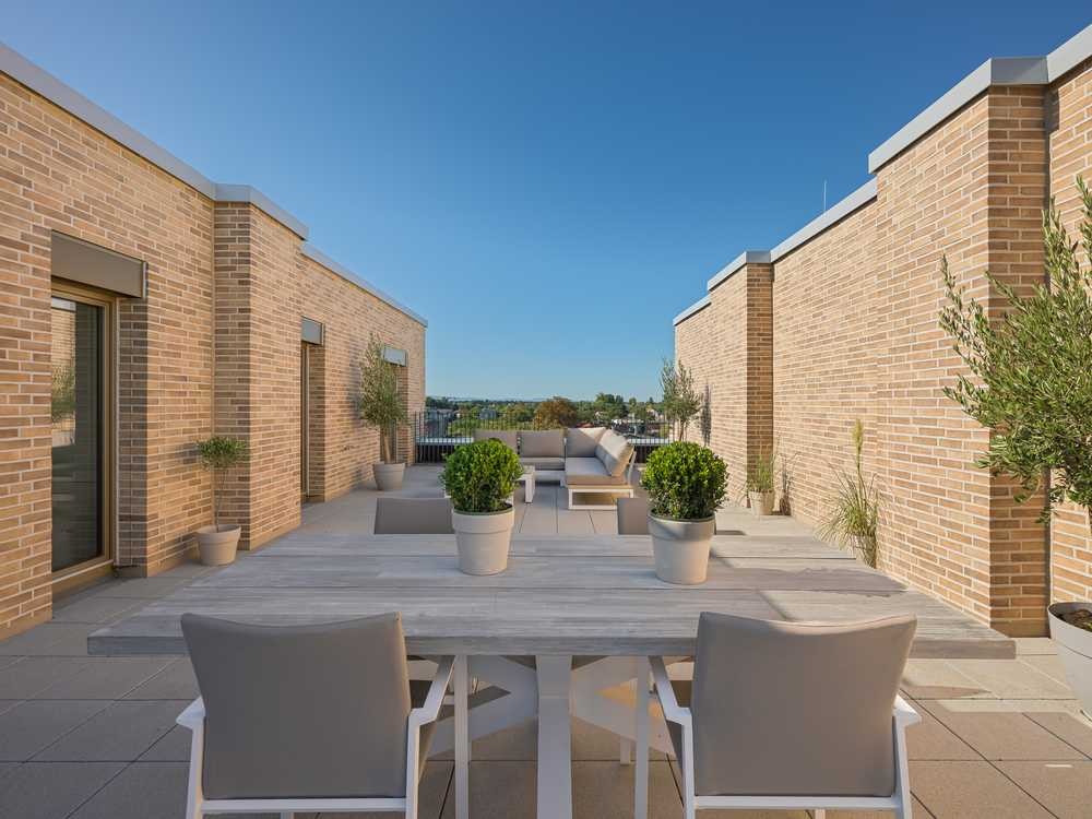 Das Herzstück bildet die großzügige Dachterrasse – geschützt vor fremden Blicken und groß genug, um das Wohnen ins Freie zu verlagern.