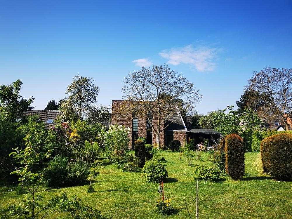 Die außergewöhnliche, dreigeschossige Immobilie trägt die Handschrift des bekannten Architekten Arno Kleinlützum, der in der Umsetzung 1980 vielseitige Funktionalität und zeitloses, einzigartiges Design kombinierte. Der naturverbundene Garten mit einem weiten, unverbaubaren Blick über die angrenzenden Felder und die moderne, pragmatische Bauweise unter Einbezug verschiedener Baumaterialien schaffen eine geborgene Offenheit, die nicht im Widerspruch steht.