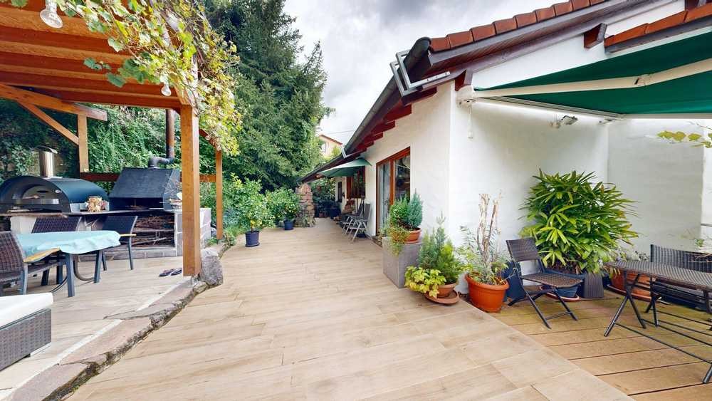 Die Außenebene des Erdgeschoßes ist mit ca. 60 m² mit 2 Terrassen terrassiert und nicht einsehbar und bietet somit absolute Privatsphäre. Die großzügigere Terrasse gegenüber vom Haupteingang mit einer Pergola von ca. 30 m² ist in den Hang hineingebaut und wird durch Natursteine an der Rückwand gestützt, diese ist ausgestattet mit einem Spanferkelgrill sowie mit einem gasbetriebenen Pizzaofen. Eine weitere kleine Terrasse mit elektrischer Markise befindet sich direkt am Haus.