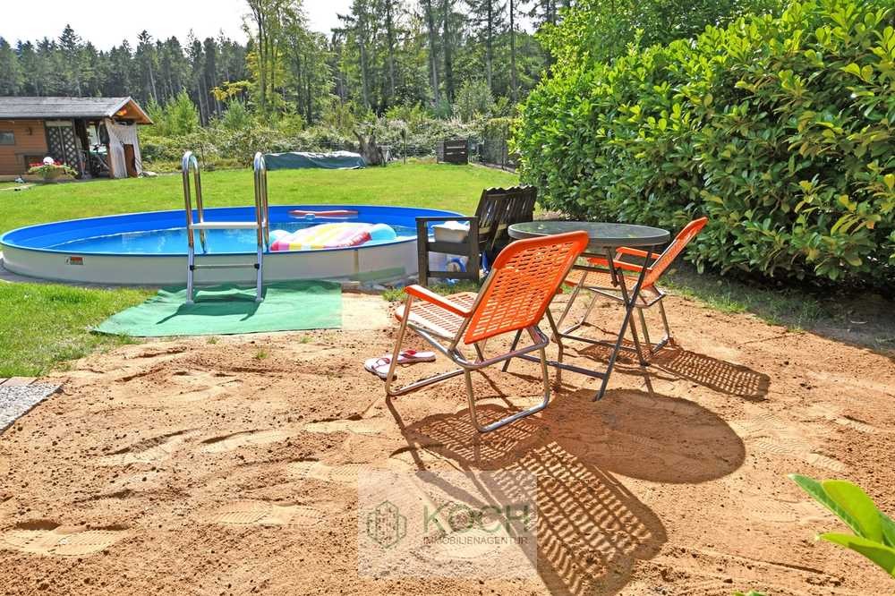 Im Garten steht eine große Terrasse, ein Gartenhaus und ein eingelassener Pool zur Verfügung.