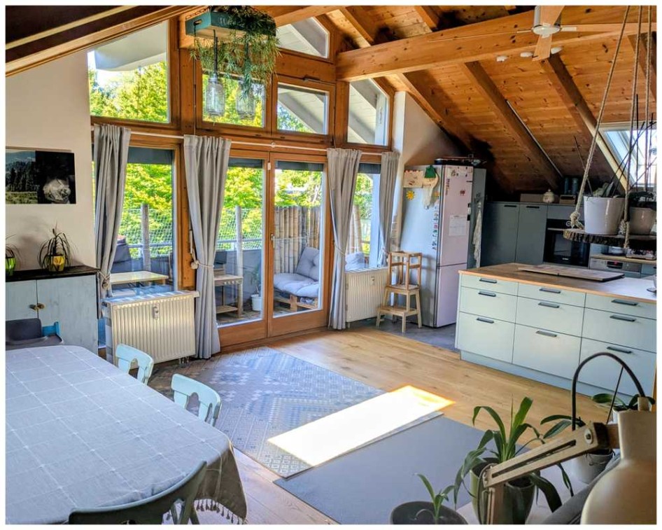 In einem gepflegten 5-Parteien-Haus erwartet Sie eine großzügige Wohnung mit offenem Wohn-/Essbereich, Sichtdachstuhl und viel Tageslicht.