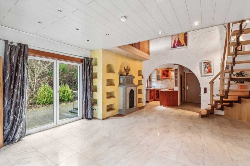 Der großzügige, helle Wohnraum empfängt Sie mit einem einladenden Kamin, der für eine gemütliche Atmosphäre sorgt. Große Terrassentüren ermöglichen den Zugang zu einem gepflasterten Außenbereich, ideal für entspannte Stunden im Freien.