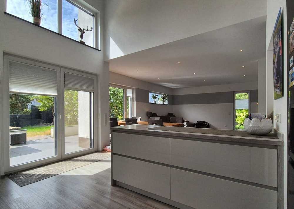 Das Herzstück des Hauses ist der 33 m² große, offene Wohn- und Essbereich, der durch eine 15 m² große Küche mit einer außergewöhnlichen 5 Meter hohen Decke ergänzt wird. Die moderne Küche ist im Kaufpreis enthalten. Eine Schiebetür führt zu einem praktischen Abstellraum. Von der Küche gelangen Sie auf die 25 m² große, geflieste Terrasse im Veranda-Stil, die mit zwei elektrischen Markisen ausgestattet ist.