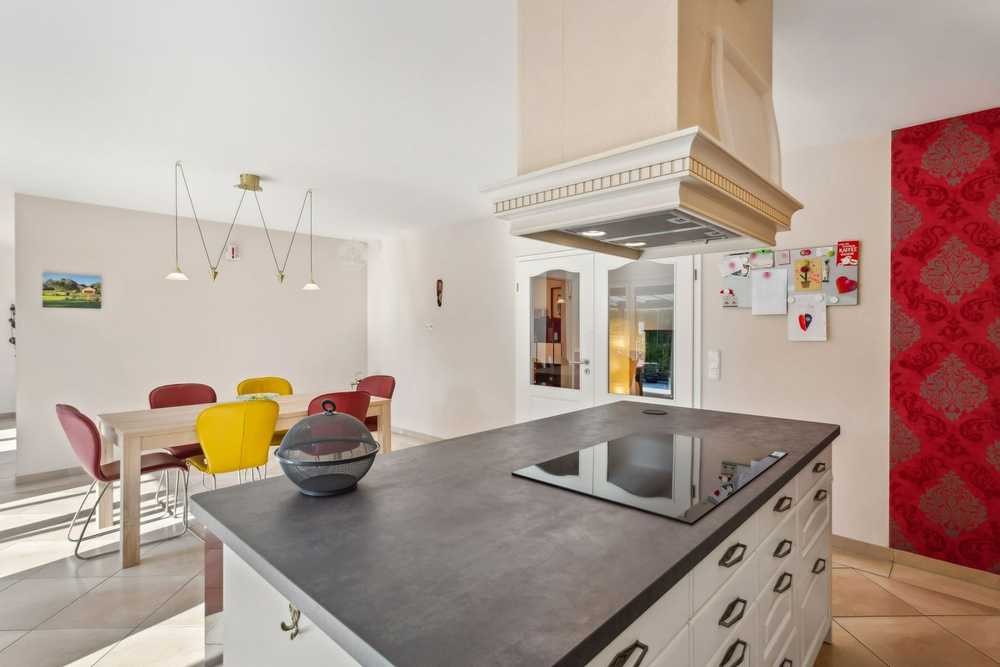 Der Elternbereich im Erdgeschoss bietet ein großzügiges Schlafzimmer mit Ankleidezimmer und ein luxuriöses Badezimmer mit Dusche und Badewanne. Das Herzstück des Hauses, der offene Wohn- und Essbereich mit moderner Küche und Kochinsel, lädt zu geselligen Stunden ein. Ein moderner Ofen sorgt im Wohnbereich für wohlige Wärme und gemütliches Ambiente. Darüber hinaus befindet sich im Erdgeschoss ein geräumiges Arbeits- oder Gästezimmer sowie ein Gäste-WC mit Dusche. Das ausgebaute, 2020 erweiterte Dachgeschoss bietet 2 großzügige Kinderzimmer und ein WC.