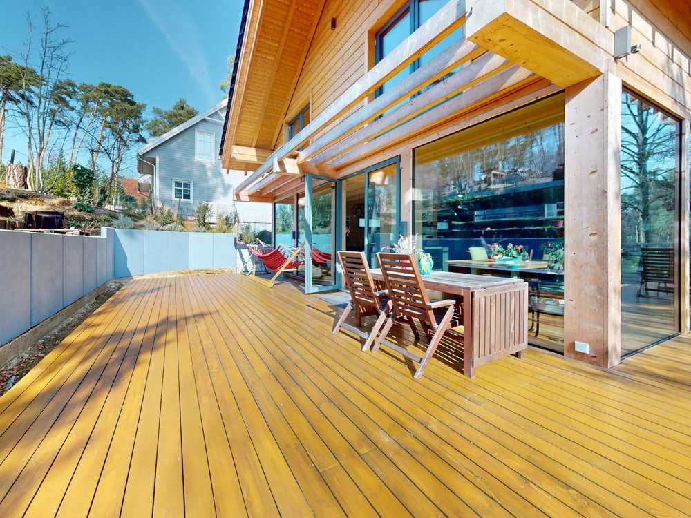 In ruhiger Hanglage gelegen, präsentiert sich dieses moderne Holzhaus aus dem Jahr 2022 als hochwertiges und energieeffizientes Zuhause mit einer Wohnfläche von ca. 152 m² auf einem ca. 971 m² großen Grundstück. Die naturnahe Lage wird durch eine großzügige Terrasse mit Blick ins Grüne ergänzt, die sowohl optisch als auch funktional den Wohnraum ins Freie erweitert. Die Terrasse bietet einen angenehmen Rückzugsort mit viel Platz für Entspannung, gesellige Abende oder sonnige Stunden im Freien.