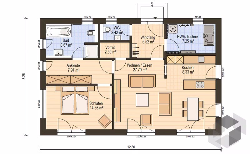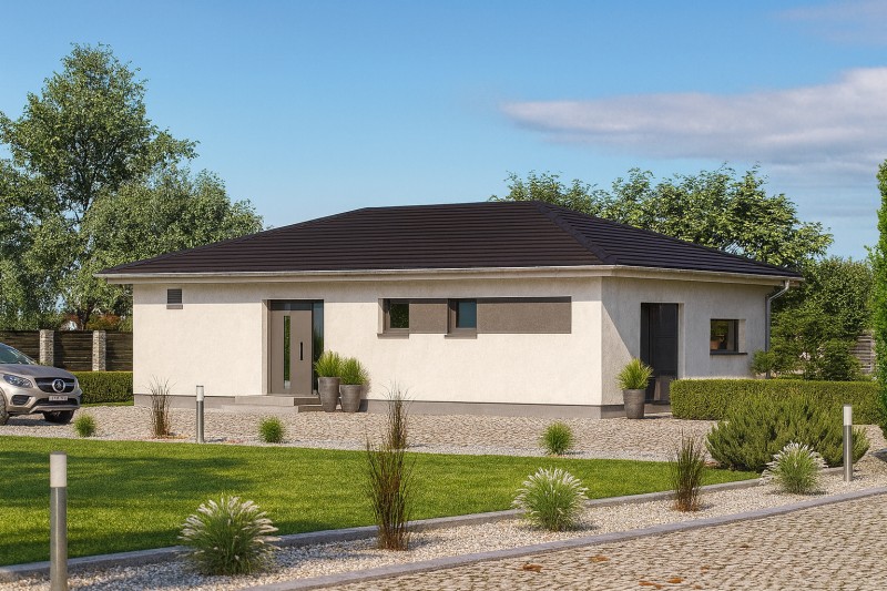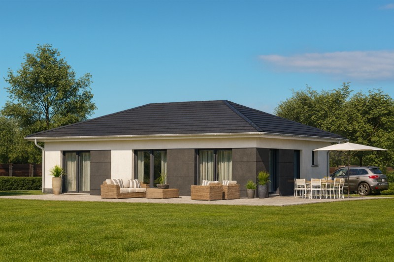 Sie schätzen mediterrane Leichtigkeit, legen zugleich aber Wert auf eine moderne Architektur? Dann ist SMARTLIFE für Sie der passende Bungalow. Das Systemhaus verfügt über die Dachform Walmdach, das durch anthrazitfarbene Ziegel einen modernen Charakter erhält. Auch bei der Fassade kommen Akzente in Grau zum Einsatz, die den Bungalow strukturieren. Innen ist das Haus aufgeteilt in drei Bereiche: