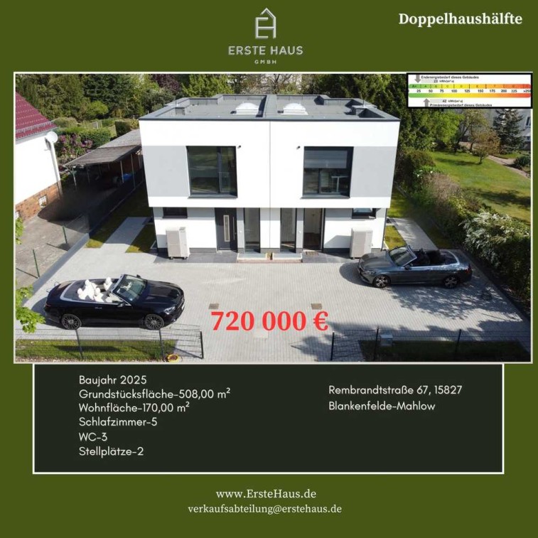 Berlin-Blankenfelde: Doppelhaushälfte 170 m², 5 SZ, A+, Einliegerwohnung - provisionsfrei