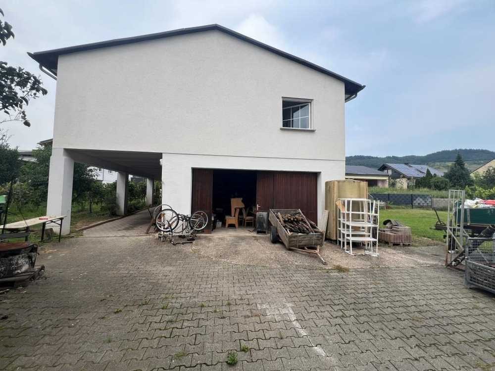 Diese führt direkt zum Garten und zum Gebäude. Im Erdgeschoss befindet sich eine große Garage, die aktuell als Lagerfläche genutzt wird. Zudem stehen ein separater Raum zur Lagerung sowie der Heizraum zur Verfügung.