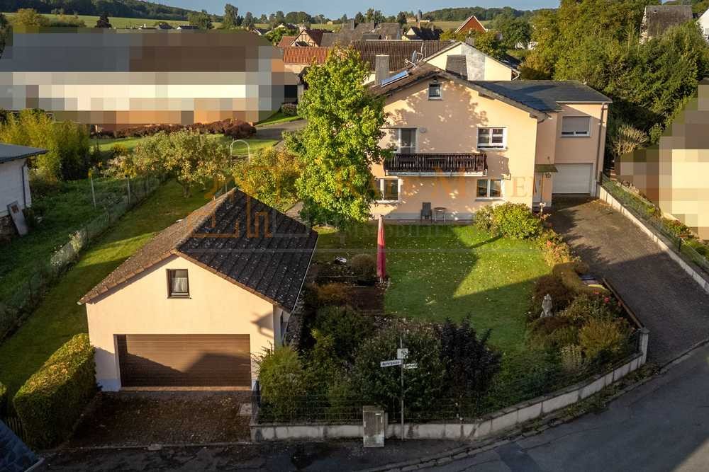 Zum Haus gehört ein ebenes Grundstück mit einer Doppelgarage mit zusätzlichem Hobbyraum im Dachgeschoss. Eine weitere Garage ist direkt vom Haus aus zu erreichen. Weitere Parkmöglichkeiten bietet der große Hof.