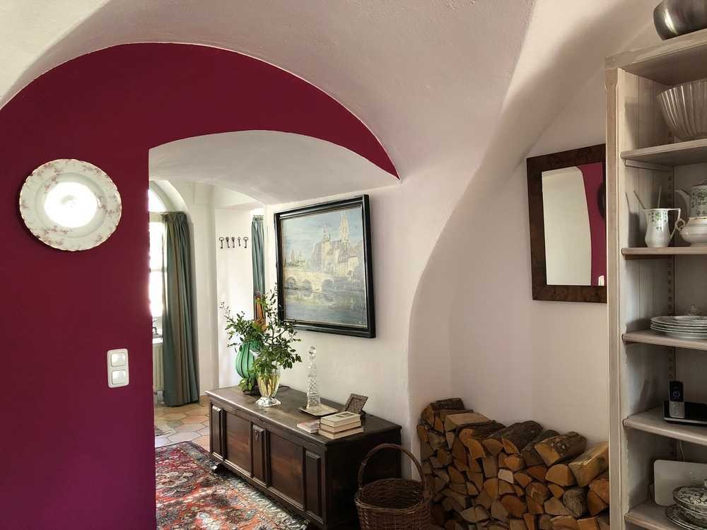 Es gibt zwei Eingänge – der Haupteingang mit Diele liegt zum Innenhof, vom Wohnzimmer aus führt eine Tür direkt zur historischen ehemaligen Zufahrt, die heute von den Hausbewohnern nur noch zu Fuß genutzt wird, um zu ihren Wohnungen zu gelangen. Über den seitlichen Wohnungsausgang erreicht man auf kürzestem Weg die großzügige Sonnenterrasse (Sondernutzungsrecht nur für die Wohnung mit ca.80 m²).