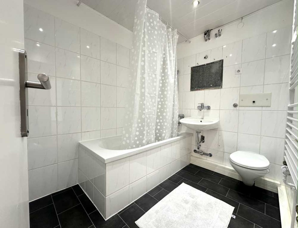 Vom Wohnzimmer führt ein kleiner Flur mit praktischem Einbauschrank in den privaten Bereich der Wohnung. Hier befindet sich das gut geschnittene Schlafzimmer sowie das innenliegende, zeitlos ausgestattete Badezimmer mit Badewanne, Hänge-WC und Waschbecken. Die Wohnung befindet sich in einem sehr gepflegten Gesamtzustand. Die Wohnanlage selbst wurde regelmäßig instand gehalten und modernisiert, sodass sich das gesamte Gebäude in einem zeitgemäßen und einladenden Zustand präsentiert.