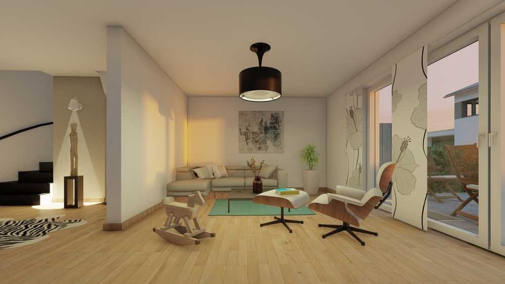 Der Mittelpunkt des Wohnens ist das großzügige Wohnzimmer, von hier geht es auf die schöne Terrasse und in den Garten.