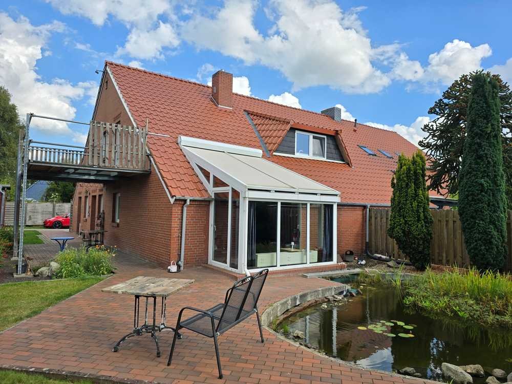 Hier erwartet Sie direkt am Wintergarten eine großzügige Terrasse mit einem wunderschön angelegten Gartenteich. Hier können Sie ihre Seele baumeln lassen und den Garten genießen.