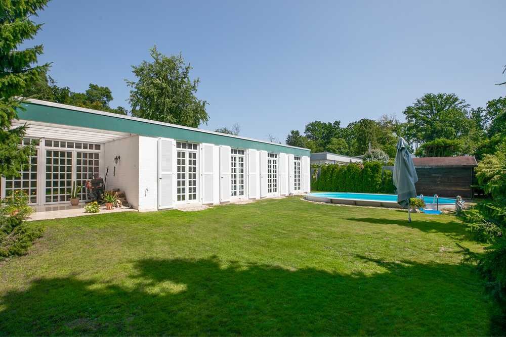 Ein besonderes Highlight ist das weitläufige Wohnzimmer mit einem großen offenen Kamin. Dank einer langen Fensterfront ist es nicht nur lichtdurchflutet, sondern bietet auch einen direkten Zugang zur überdachten Terrasse. Von hier aus genießt man den Blick in den großen, liebevoll angelegten Garten – eine grüne Oase der Ruhe mit eigenem Swimmingpool, ideal für entspannte Stunden im Freien.