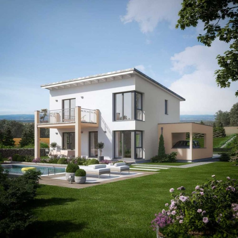 Das eigene Haus ist für die meisten Menschen etwas ganz Besonderes: Es ist ein Ort der Ruhe und Erholung, der ihnen ganz allein gehört. Dementsprechend individuell sollte es gestaltet sein - nicht nur im Innern, sondern auch von außen. Wie wäre es beispielsweise mit diesem modernen Fertighaus, das von einem vergleichsweise selten zu sehenden Pultdach gekrönt wird? Die Dachform bietet viele Vorteile: So ist die Konstruktion einfacher als bei anderen Dachformen und erfordert gleichzeitig weniger Materialien. Zudem lässt sich das Obergeschoss uneingeschränkt nutzen, da es keine störenden Schrägen gibt. Persönliche Akzente können mit verschiedenen Architektur-Bauteilen gesetzt werden. Bei diesem Entwurf wird der kubische Hauptbaukörper durch ein Design-Carport und einen Terrassenbalkon, der von eleganten Stützen getragen wird, erweitert. Mit ihrem sanften Pastellton verleihen sie dem Haus ein Hauch von Urlaubsflair. Im Innern überzeugt das Haus mit einem offenen Grundriss, der sich an den Bedürfnissen einer vierköpfigen Familie orientiert. Schon vom Eingang aus fällt der Blick durch die Diele und den Wohn-, Ess- und Kochbereich bis hinaus auf die Terrasse. Die gemütliche Sitzecke mit Couch und Fernseher ist dank der L-Form nicht direkt einsehbar. So bleibt die Privatsphäre gewahrt. Links an die Diele schließen sich der Technikraum, eine Garderobe und ein kompaktes Bad mit Dusche an. Rechts liegt ein flexibel nutzbarer Raum. Auf den knapp 10 m² könnten sich die Bauherren beispielsweise ein Homeoffice, einen Hobbyraum oder auch ein zusätzliches Kinderzimmer einrichten. Eine geradläufige Treppe führt die Bewohner hinauf in das Obergeschoss, das sich dank bodentiefer Fenster und Übereck-Verglasung genauso lichtdurchflutet präsentiert wie das Erdgeschoss. Dem Nachwuchs stehen zwei gleich große Zimmer zur Verfügung, von denen eines einen Zugang zum Balkon besitzt. Die Eltern können sich über ein geräumiges Schlafzimmer - ebenfalls mit Balkonzugang - sowie eine Ankleide freuen. Abgerundet wird das Wohlfühlprogramm von einem Wellnessbad.