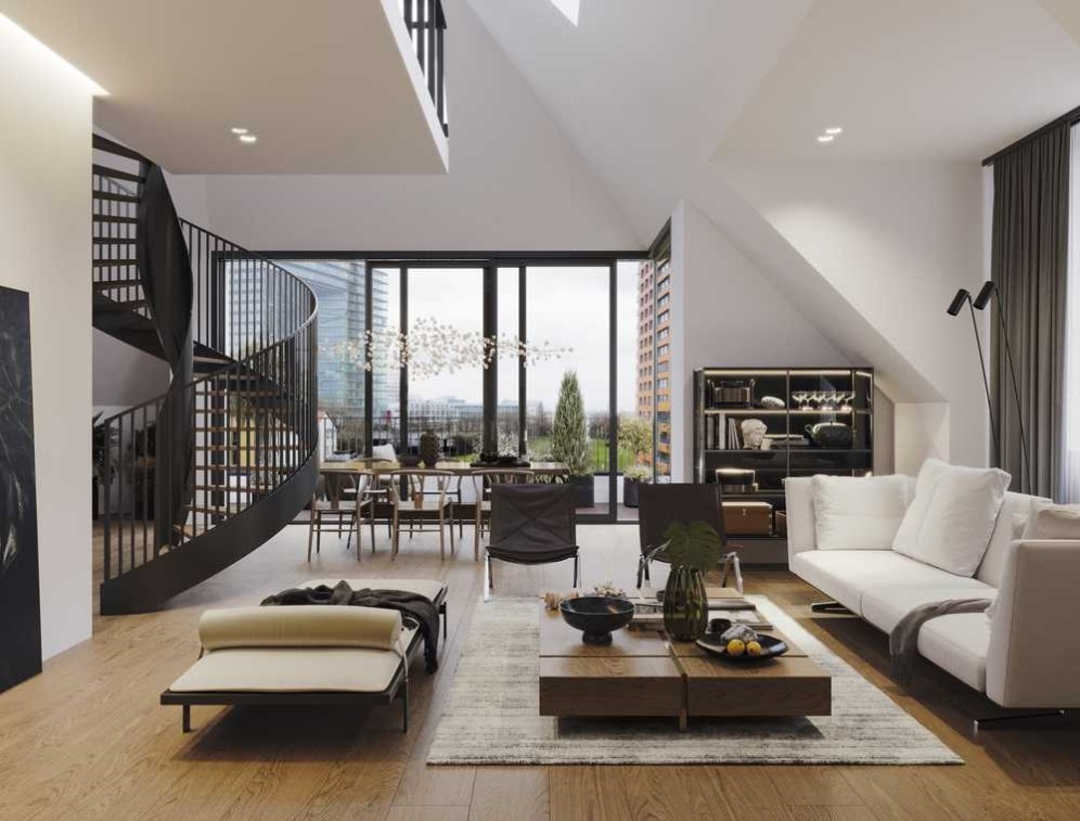 Neues Penthouse auf zwei Etagen (160m² Wohnfläche zzgl. 50m² zu Wohnzwecken ausgebaute Nutzfläche, Fertigstellung Ende 2026) mit Möglichkeit individuelle Wünsche einzubringen. Großzügiger Wohn-/Essbereich mit offener Küche, Kamin und bodentiefen Fenstern. Weitläufige Dachterrasse mit Blick auf Fernsehturm, Stadttor und Medienhafen sowie zusätzlicher Balkon zum ruhigen Innenhof. Eine ca. 50 m² große Galerie bietet Platz für Leseecke, Atelier oder Kunst. Schlafzimmer mit Ankleide und luxuriösem Bad mit Sauna, freistehender Wanne und großer Dusche, separates WC. Gäste- oder Arbeitszimmer, Hauswirtschaftsraum, Klimaanlage in Wohn- und Schlafräumen und Aufzug mit direktem Zugang unterstreichen den hohen Wohnkomfort. Dieses Penthouse vereint modernes, lichtdurchflutetes Wohnen mit exklusiver Ausstattung und Toplage – ideal für alle, die ein stilvolles Leben in Düsseldorf suchen.