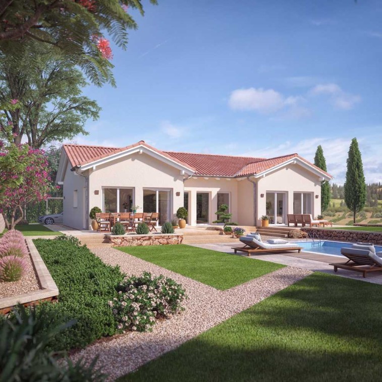 Ein Bungalow eignet sich nur für Singles oder ältere Paare? Keineswegs! Den Gegenbeweis tritt dieser großzügig dimensionierte Entwurf an. Mit einer Wohnfläche von mehr als 130 m² steht er dem Platzangebot eines herkömmlichen zweistöckigen Einfamilienhauses in nichts nach. Dabei bietet er ein Plus an Komfort. So kann auf Treppen, die nicht nur mühselig zu erklimmen sind, sondern auch eine Gefahr für ältere Menschen und Kleinkinder darstellen, komplett verzichtet werden. Stattdessen sind alle Räume ebenerdig angeordnet, was das familiäre Miteinander intensiviert. Die Basis des Fertighauses bildet ein rechteckiger Baukörper, der durch zwei symmetrisch angeordnete Querhäuser erweitert wird. Durch die U-Form entsteht ein gemütlicher Terrassenbereich, der nicht nur vor fremden Blicken, sondern auch vor Wind und starker Sonneneinstrahlung abgeschirmt wird. Gekrönt werden beide Architektur-Bauteile - ebenso wie der Hauptbaukörper - von flach geneigten Satteldächern. Sie verleihen dem Haus einen modernen Landhauslook. Im Zusammenspiel mit einer pastellfarbenen Fassade und einer roten Dacheindeckung entsteht ein mediterranes Flair, das Lust auf Urlaub in den eigenen vier Wänden macht. Ausgedehnte Fensterflächen lassen den Bungalow dabei leicht und transparent wirken und fluten die Innenräume mit natürlichem Licht. Dank der offenen Raumaufteilung kann es sich hier in jeden Winkel ausbreiten. Schon beim Betreten des Hauses fällt der Blick durch die Diele und den Wohn-, Ess- und Kochbereich hindurch bis hinaus in den Garten. An die Küche grenzt ein Technik- bzw. Hauswirtschaftsraum an. Wer den Platz lieber für eine geräumige Speisekammer nutzen möchte, der kann die Heiz- und Haustechnik natürlich auch in einem Keller unterbringen. Über einen schmalen Flur werden die Privaträume erschlossen. Ein luftiger Masterbedroom mit Gartenzugang und begehbarem Kleiderschrank, ein helles Kinderzimmer und ein geräumiges Familienbad lassen Wohnträume wahr werden. Besonders praktisch ist das zweite Bad mit Dusche neben dem Eingangsbereich. Abgerundet wird das Raumprogramm von einem hellen Büro.