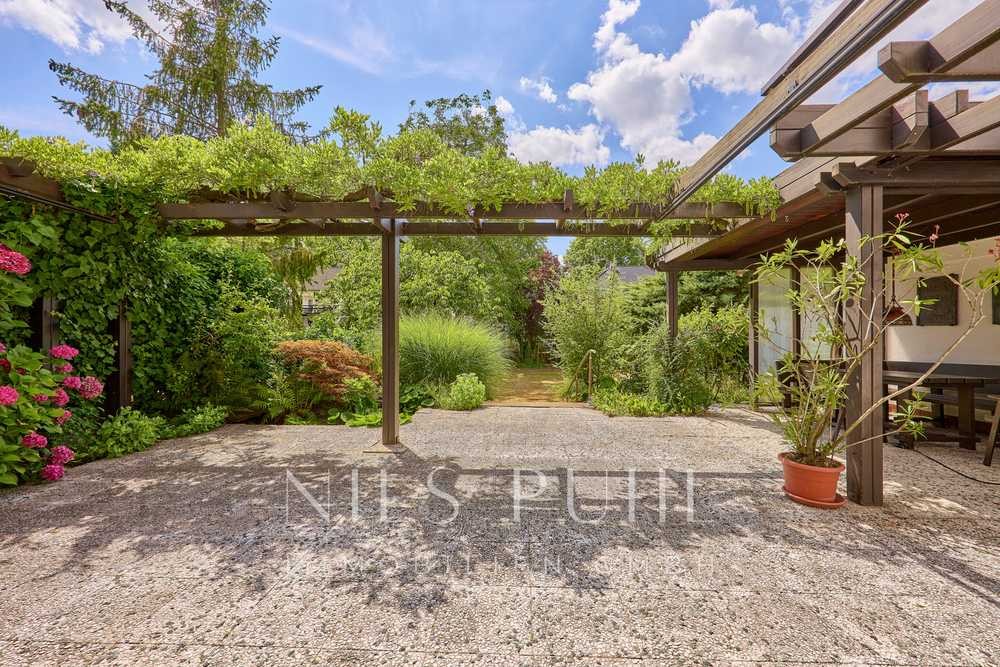 Der Wohn- und Essbereich ist durch eine Glasabtrennung vom Flur getrennt und wirkt hell und einladend – bereits beim Betreten eröffnet sich der Blick in den Garten. Hochwertige Einbauschränke, ein Kamin sowie die Möglichkeit, die Küche zu öffnen, unterstreichen den zeitgemäßen und zugleich flexiblen Grundriss.