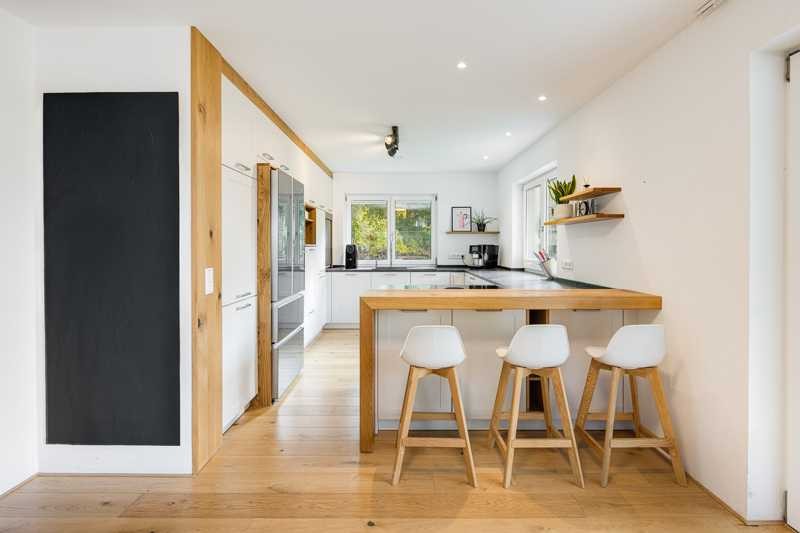Die Beschreibung passt gleichermaßen für das 2022 in Massivbauweise fertiggestellte Haus mit Garten. Es ist das passende Zuhause für eine Familie mit zwei und auch drei Kindern. Man sieht viel Grün, schaut auf Berge und draußen auf der Terrasse schnuppert man den Duft vom angrenzenden Wald.