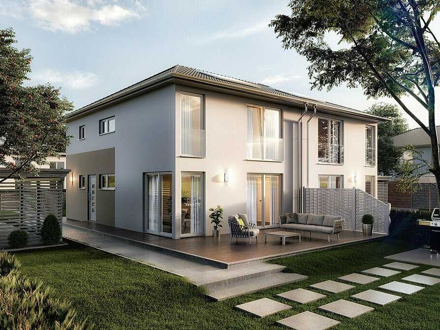 Die geradlinige Architektur gibt dem Doppelhaus Aura 136 seinen urbanen Charakter, die moderne Grundrissgestaltung macht dieses Stadthaus zu einem echten Familienhaus.
