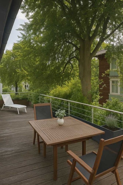 - Die große Dachterrasse mit Bangkirai-Holzdielen und Edelstahlgeländer bietet viel Platz für Loungemöbel, Essbereich und individuelle Gestaltungsideen.