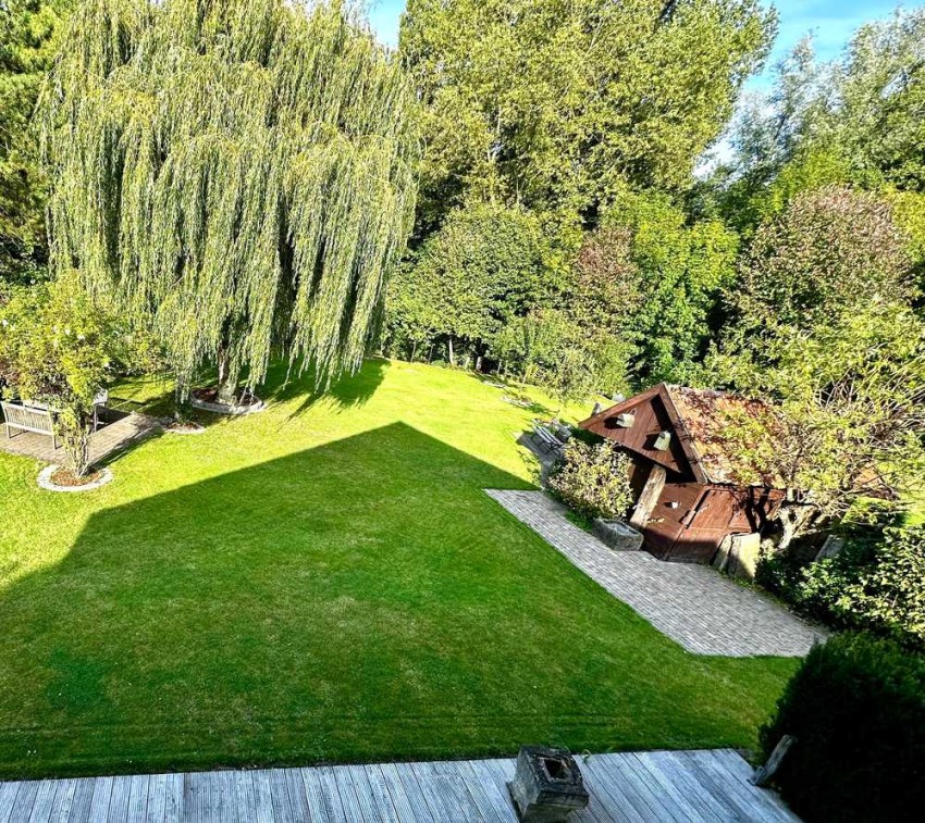 Von der großzügige Terrasse vorm Wohnzimmer sowie vom Balkon am Schlafzimmer hat man einen zauberhaften Blick in den traumhaften Garten auf die Baumkulisse mit einer alten Trauerweide am Angelfluß.