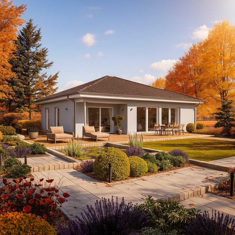 Entdecken Sie das AMBIENCE 77, einen modernen Bungalow, der Ihre Wohnträume wahr werden lässt. Mit einer Wohnfläche von 91 m² und einer cleveren Raumaufteilung bietet dieses Fertighaus stilvolles und komfortables Wohnen für zwei Personen. Die architektonische Vielfalt mit verschiedenen Dachformen und Varianten wie Querhaus oder Übereck-Erker verleiht dem AMBIENCE 77 einen besonderen Charme. Der offene Wohnbereich fördert geselliges Zusammensein und verbindet Küche und Wohnzimmer harmonisch. Das Schlafzimmer mit Ankleide bietet einen privaten Rückzugsort, während das Badezimmer mit Dusche und Wanne zur Entspannung einlädt. Der kompakte Bungalow passt perfekt auf Ihr Grundstück - ohne Untergeschoss.