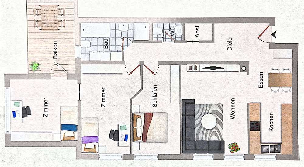 Diese Wohnung im Erdgeschoss bietet eine durchdachte Aufteilung mit vier Zimmern, einem Badezimmer mit Badewanne/Dusche sowie einem separaten Gäste-WC genügend Platz für klein und groß Familien.