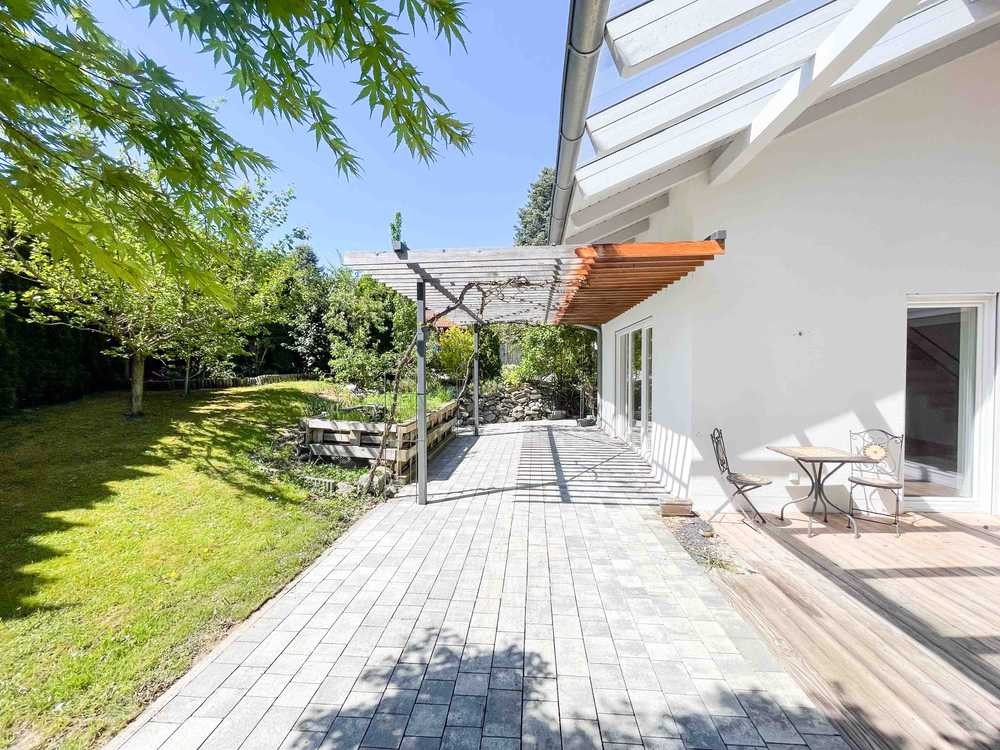 Die außen nicht einsehbare Gartenanlage ist liebevoll gestaltet und bietet Rückzugsmöglichkeiten sowie Platz für Freizeitaktivitäten. Die zentrale, geschützte Terrasse mit Glasüberdachung und erweiterter Freiterrasse inklusive stilvoller Pergola schafft ein besonderes Flair.