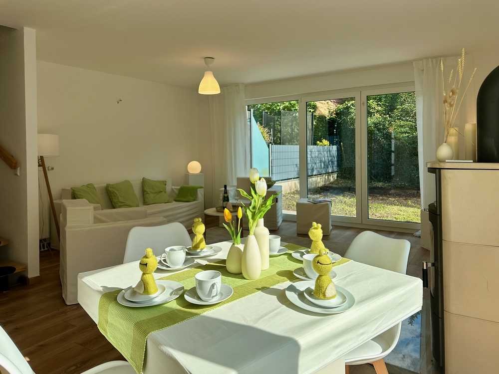 Der offen gestaltete Grundriss im Küchen-/Wohn-/Essbereich schafft eine angenehme familiäre Wohnatmosphäre. Auf der Terrasse mit Ausrichtung nach Osten genießen Sie die Morgensonne, der Garten mit Ausrichtung nach Süd-Osten fängt die Mittagssonne ein.