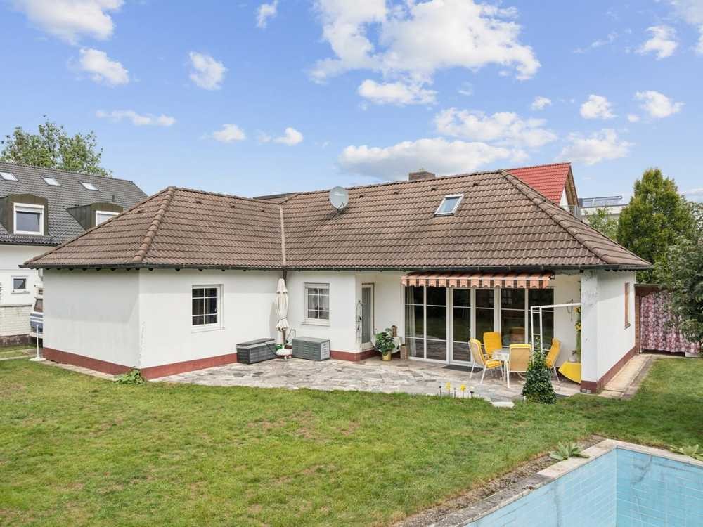Dieses Einfamilienhaus aus dem Jahr ca. 1963 lädt mit seinem besonderen Charakter und einem großzügigen Grundstück von ca. 755 m² dazu ein, der perfekte Rückzugsort für Ihre Familie zu werden. Mit einer Wohnfläche von ca. 106 m², verteilt auf das Erdgeschoss, bietet es eine durchdachte Raumaufteilung, die gemütliche Wohnbereiche mit funktionaler Nutzung verbindet. Das Dachgeschoss steht Ihnen für zukünftige Ausbauideen offen und lässt viel Potenzial für zusätzlichen Wohnraum. Herzstück des Hauses ist der helle Wohn- und Essbereich, der mit großen Fensterfronten einen wunderbaren Blick in den weitläufigen Garten eröffnet. Hier lässt es sich entspannen, spielen und das Familienleben in vollen Zügen genießen. Die Terrasse lädt zu lauen Sommerabenden und geselligen Runden ein, während der gepflegte Außenpool für Abkühlung und Urlaubsfeeling direkt vor der Haustür sorgt. Das Haus verfügt über mehrere gemütliche Zimmer, die sich flexibel als Schlafzimmer, Kinderzimmer oder Homeoffice nutzen lassen, sowie eine Küche, die zum gemeinsamen Kochen und Genießen einlädt. Das große Grundstück bietet viel Platz zum Toben für Kinder, für Hobbygärtner oder für entspannte Stunden im Grünen. Dank der ruhigen Lage in einer gewachsenen Wohngegend genießen Sie hier Privatsphäre und Erholung, ohne auf die Nähe zu Einkaufsmöglichkeiten, Schulen und öffentlicher Anbindung verzichten zu müssen. Die dargestellten Innenaufnahmen wurden digital bearbeitet, persönliche Gegenstände wurden aus Gründen des Persönlichkeitsschutzes entfernt.