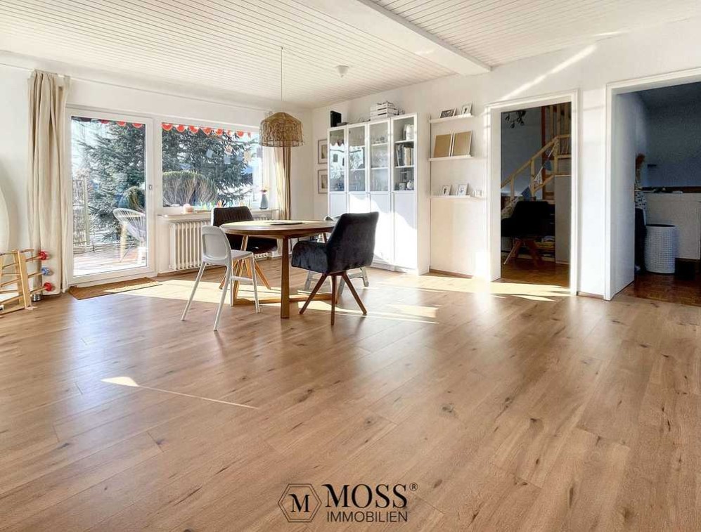 Auf zwei lichtdurchfluteten Wohnetagen verteilen sich insgesamt 205 m² Wohnfläche, aufgeteilt in zwei separate Wohneinheiten. Die Erdgeschosswohnung umfasst 105 m² und begeistert mit einem einladenden Essbereich, Akustikpanele setzen elegante Akzente. Neben einem gemütlichen Wohnzimmer ist auch die moderne, neuwertige Küche mit allem ausgestattet, was das Herz begehrt. Die matt-schwarze Verkleidung bildet einen harmonischen Kontrast zu dem allgegenwärtigen Weiß und den warmen Holztönen. Die zwei Schlafzimmer werden von einem kleineren Zimmer ergänzt, welches sich perfekt als Ankleidezimmer eignet.