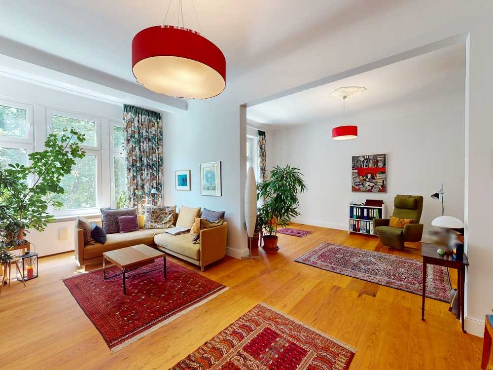 Die Wohnung beeindruckt mit großzügigen Raumhöhen, eleganten Pitch-Pine-Dielen und lichtdurchfluteten Zimmern. Zwei ehemals getrennte Räume wurden zu einem weitläufigen Wohnzimmer zusammengeführt, das mit einem Balkon zur Straßenseite hin zum Entspannen einlädt. Auf Wunsch lässt sich die ursprüngliche Vierzimmeraufteilung problemlos wiederherstellen.