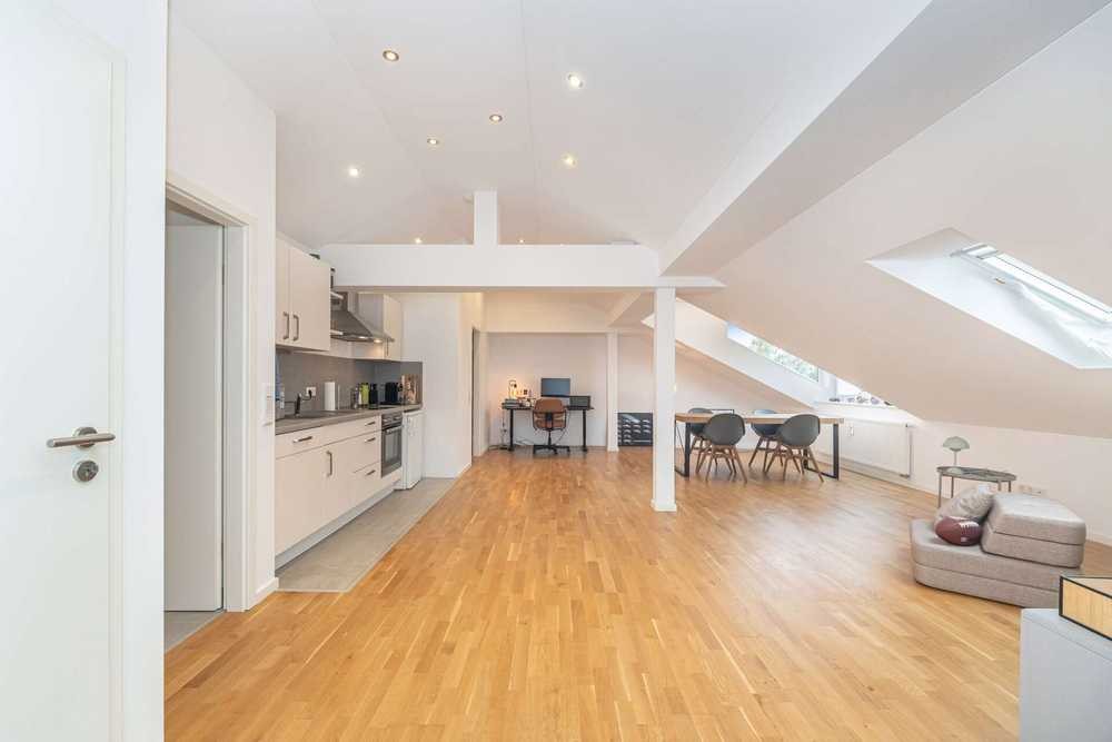 Bereits beim Betreten der Wohnung beeindruckt der großzügige Wohn- und Essbereich mit offener Küchenzeile durch seine Helligkeit und das angenehme Raumgefühl. Mit rund 44 m² bildet dieser Bereich das Herzstück der Wohnung. Die charmante Gaube verleiht dem Raum zusätzlich eine besondere Raumatmosphäre.