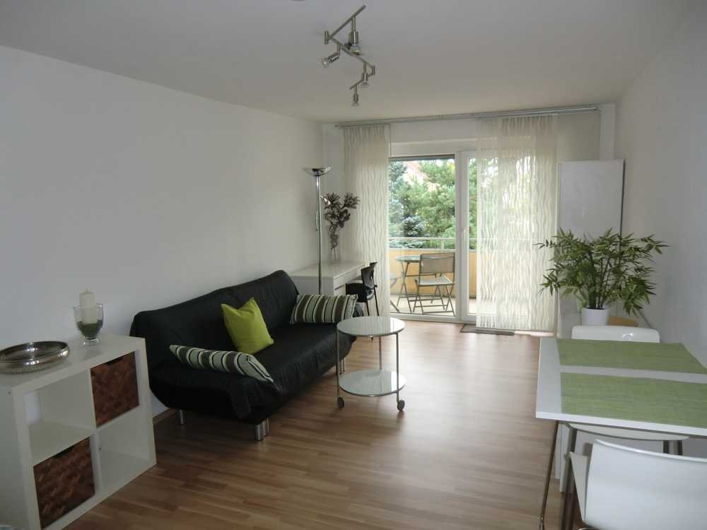 Der zentrale Flurbereich (mit separater Nische für Staubsauger etc.) führt in den hellen Wohn-/Schlafbereich mit Zugang zum Balkon. Dieser überzeugt duch seinen Blick ins Grüne und bietet viel Platz zum Entspannen.