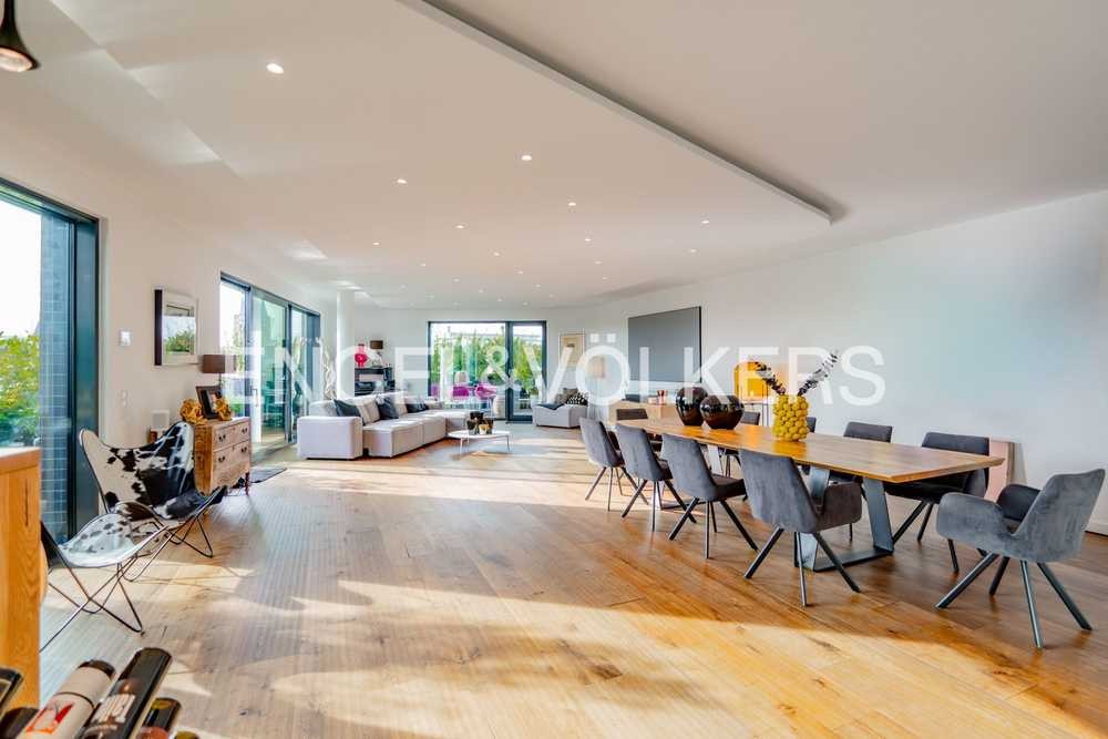 Herzlich willkommen in Ihrem neuen Zuhause über den Dächern von Kassel: Dieses außergewöhnliche Penthouse mit ca. 302 m² Wohnfläche in der Unterneustadt vereint zeitlose Eleganz, hochwertige Ausstattung und einen unvergleichlichen Ausblick auf das Urbane wie auch das Grüne der Stadt. Privatsphäre beim Zugang zu Ihrem luxuriösen Penthouse mit insgesamt 6 Zimmern ist durch den eigenen Aufzug gewährleistet, der Sie direkt in Ihr Loft führt. Diesen erreichen Sie von Ihren beiden Duplex-Stellplätzen in der Tiefgarage, die speziell für schwere Fahrzeuge konzipiert sind. Alternativ ist selbstverständlich ein Zugang über das Treppenhaus möglich. Der großzügige Wohn- und Essbereich beeindruckt mit durchgehendem Eichenfußboden, maßgefertigten Einbauschränken sowie einem modernen, indirekten LED-Lichtkonzept, das eine einladende Atmosphäre schafft. Bodentiefe Fenster mit 3-Fach Verglasung öffnen den Blick weit über Kassel hinaus und die durchgehende Deckenhöhe von drei Metern schafft ein angenehmes und offenes Raumgefühl. Der Master-Bedroom erfüllt höchste Ansprüche: Neben einer private Terrasse mit Whirlpool, erwarten Sie ein von zwei Seiten begehbarer Ankleidebereich sowie ein exklusiver Spa-Bereich. Hier finden Sie eine große Schwall-Dusche, eine Design-Badewanne, hochwertige Armaturen, Keramik und Naturstein. Eine Tageslicht-Sauna mit Blick in die Kasseler Aue machen dieses Penthouse zu einem echten Wohlfühlrefugium. Mit zwei begrünten Sonnenterrassen von insgesamt ca. 84 m² genießen Sie den Luxus weitläufiger Außenbereiche – ausgestattet mit Somfy-Markisen. Die offene Küche bietet kompromisslose Qualität: Hochwertige Schreinerarbeiten mit nahtlos integrierten, modernen Miele-Einbaugeräten und eine klare Designsprache vereinen Funktionalität mit Ästhetik. Sämtliche Räume sind selbstverständlich klimatisiert. Ein separater Kellerraum rundet das Raumangebot ab. Pläne für eine Teilung liegen ebenfalls vor, sprechen Sie uns gerne darauf an.