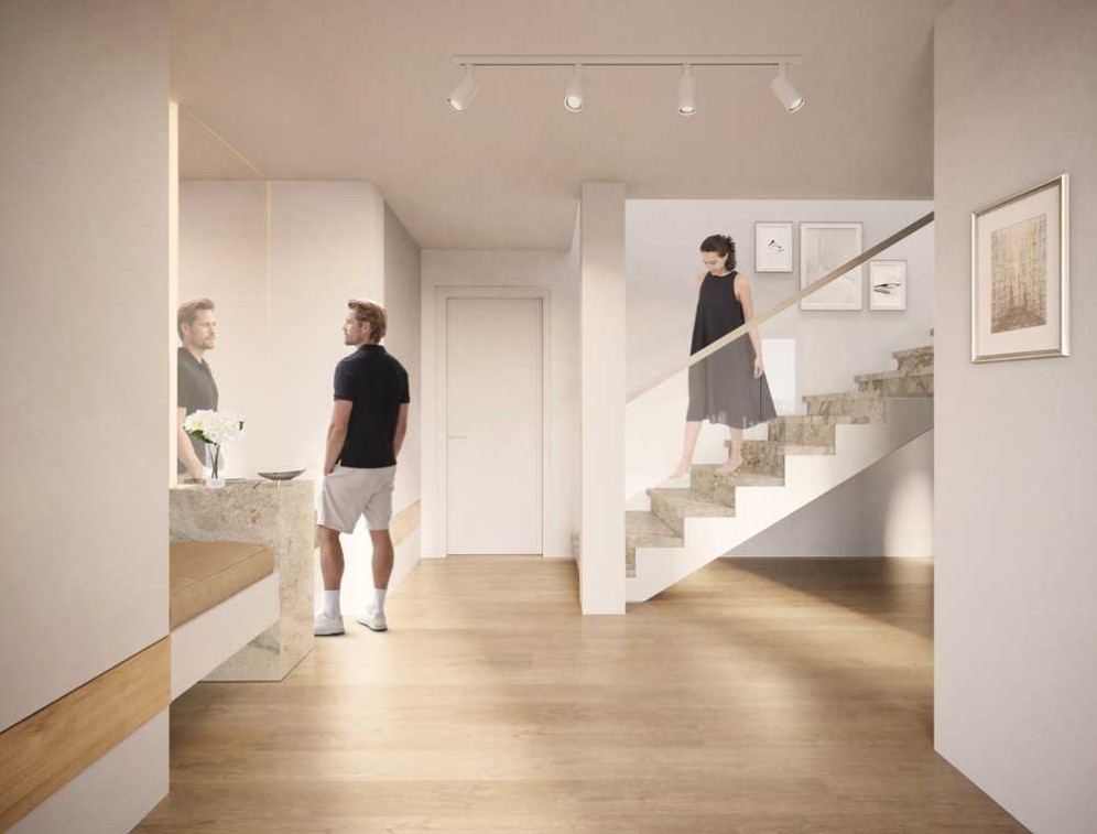 Im Erdgeschoss des Wohnhauses befindet sich ein großer, lichtdurchfluteter Wohn-Essbereich mit offener Küche und angrenzender Speisekammer. Ebenfalls befindet sich auf dieser Ebene der Technikraum und ein Gäste-WC. Der geräumige Flur bietet Platz für eine Garderobe und von hier führt die Treppe ins Obergeschoss.
