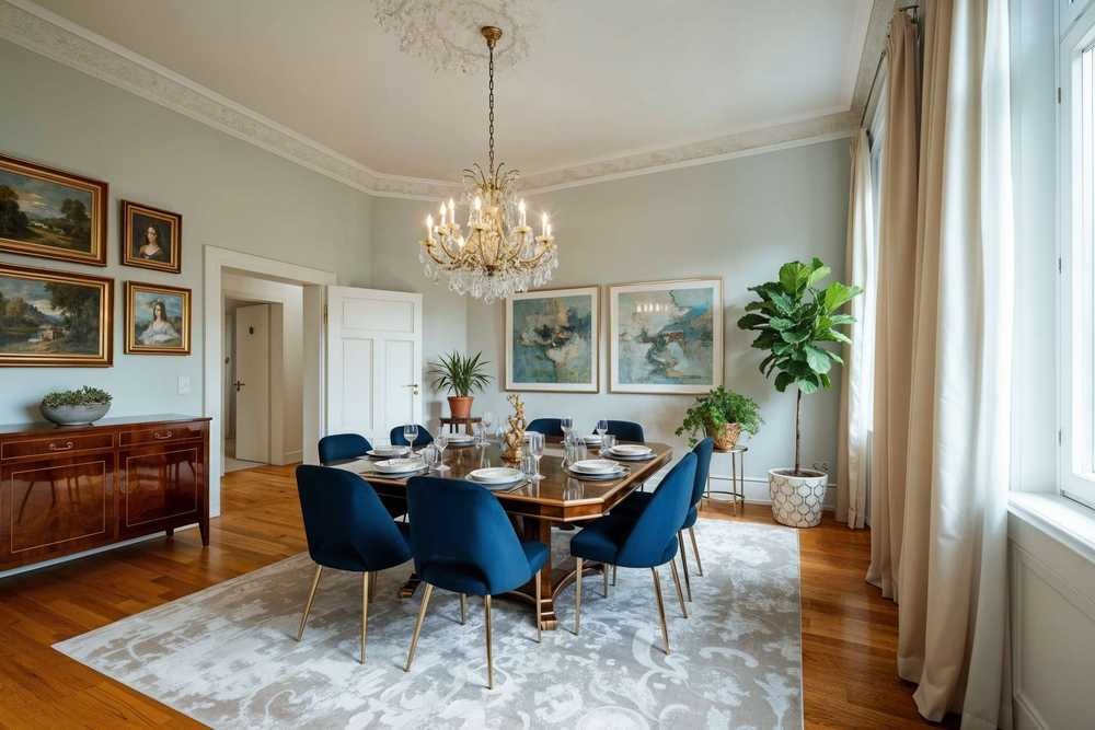 Die Raumaufteilung bietet großzügige, lichtdurchflutete Zimmer mit hohen Decken und aufwendig gearbeiteten Stuckelementen. Der historische Parkettboden verleiht den Räumen Wärme und Authentizität. Die großen Fenster lassen viel Tageslicht herein und schaffen eine helle, einladende Atmosphäre.