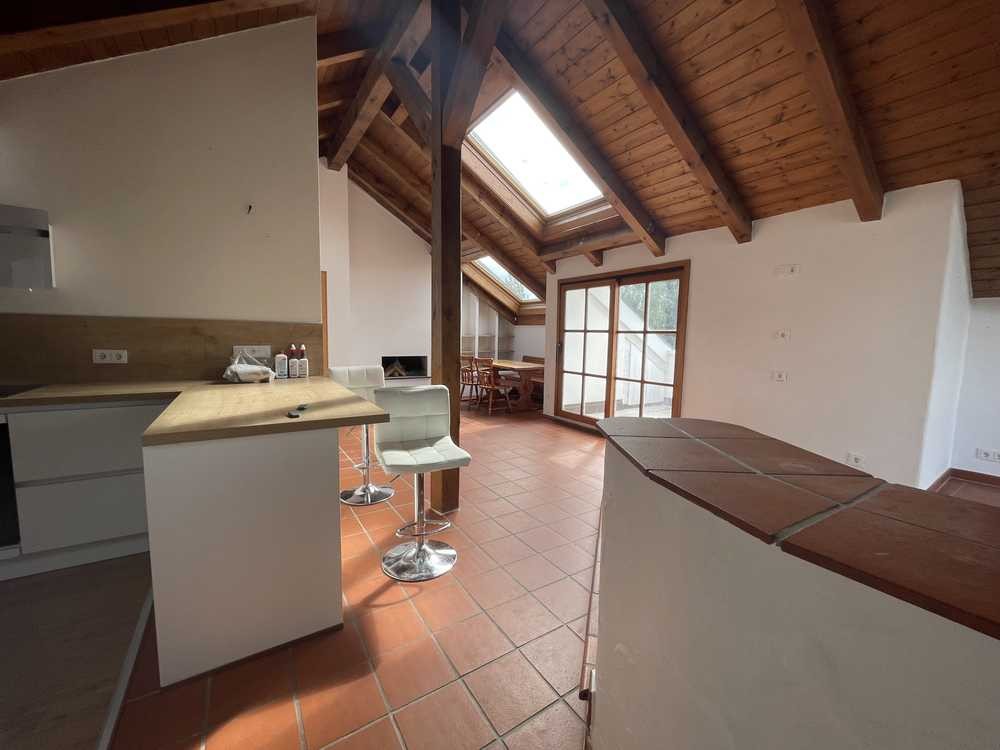 Die Wohnung besticht durch einen offenen, lichtdurchfluteten Wohn-Essbereich mit charakteristischer Holzbalkendecke und einer Terrasse, die absolute Privatsphäre bietet – perfekt zum Entspannen oder für gesellige Stunden.