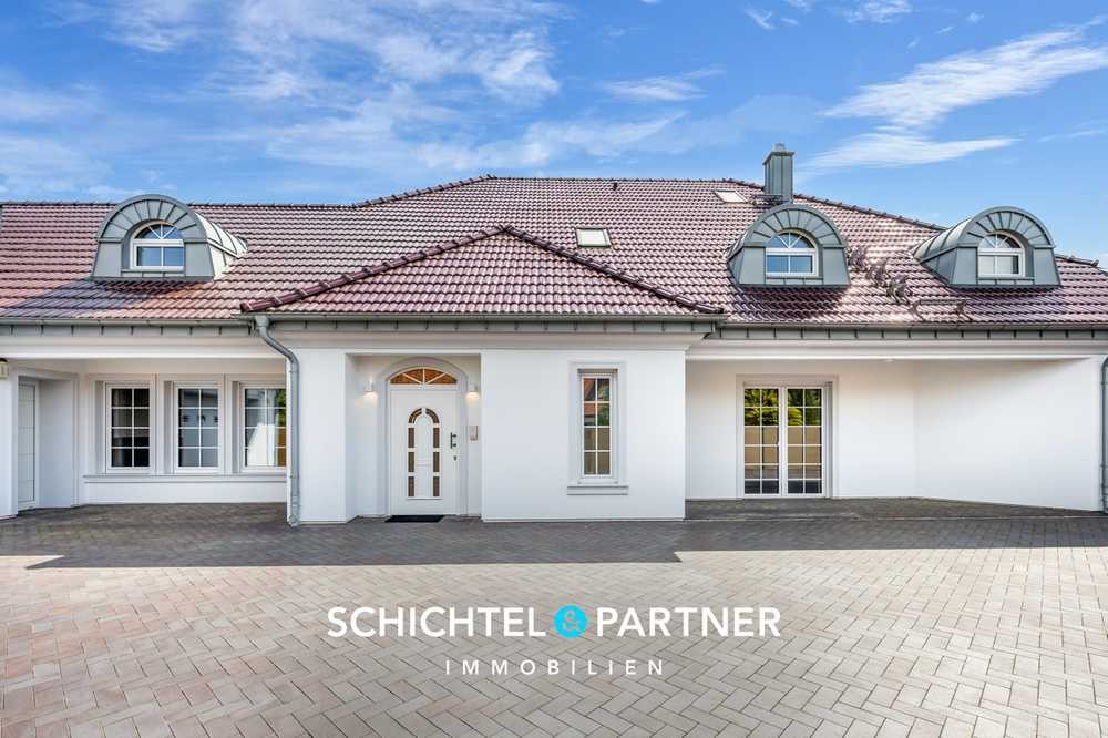 Über die Auffahrt gelangen Sie auf das umzäunte Grundstück, welches Sie durch den erhabenen Eingangsbereich in die Immobilie führt. Von hier aus erreichen Sie alle Räumlichkeiten des Erdgeschosses.