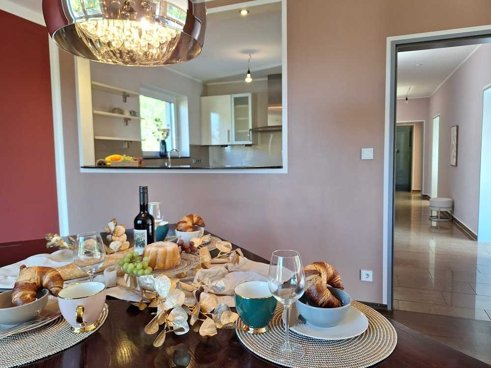 Die Hauptwohnung im Erdgeschoss verfügt über ca. 120 m² Wohnfläche und überzeugt durch eine großzügige und funktionale Aufteilung. Herzstück ist der offen gestaltete Wohn- und Essbereich mit rund 49 m², verbunden mit einer großzügigen Küche – ideal für gemeinsame Abende, Kochen mit Gästen oder entspannte Homeoffice-Tage. Ein großes Vollbad sowie ein separates Gäste-WC sorgen für Komfort im Alltag. Ergänzt wird das Raumangebot durch ein ruhiges Schlafzimmer und ein separates Arbeitszimmer, das konzentriertes Arbeiten von zu Hause ermöglicht. Die Ausrichtung des Hauses zur Talseite hin sorgt für einen weiten Blick ins Grüne und unterstreicht die ruhige, naturnahe Wohnatmosphäre.