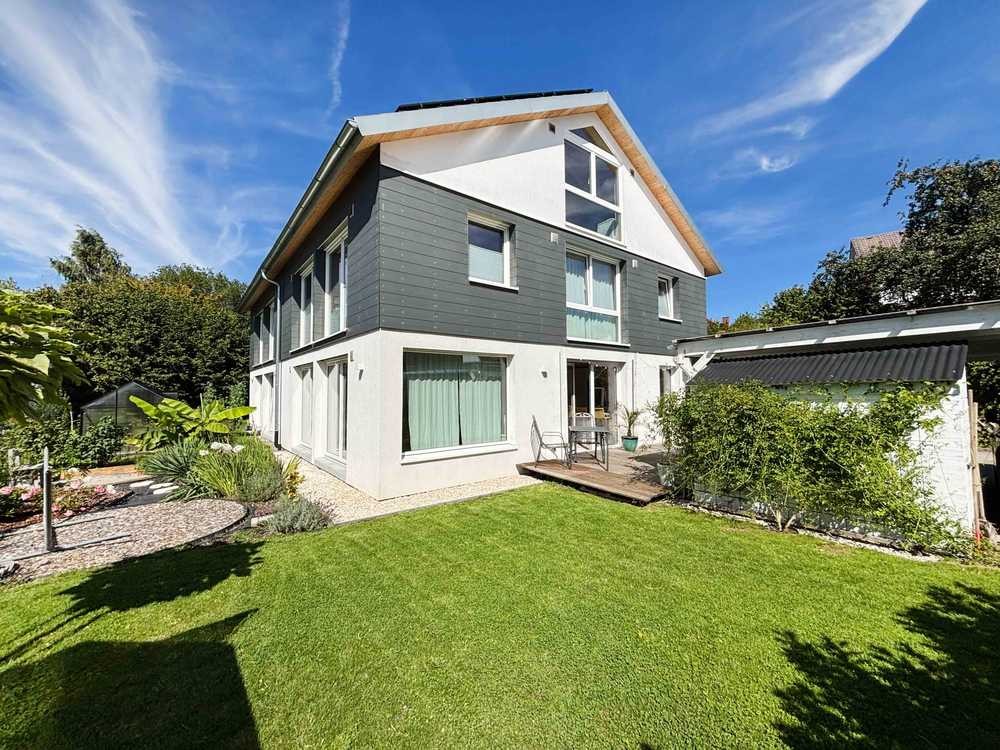 Diese moderne Doppelhaushälfte mit einer Wohnfläche von ca. 178 m² ist das ideale Zuhause für Familien. Im Erdgeschoss gelangen Sie vom Eingangsbereich mit Garderobenmöglichkeit in einen offenen Wohn- und Essbereich. Große Fensterfronten sorgen für viel Tageslicht und bieten Zugang zum Garten. Angrenzend befindet sich die weiße Einbauküche sowie ein Technik- und Abstellraum. Ein Gäste-WC mit Anschlüssen für Waschmaschine und Trockner ist ebenfalls auf dieser Ebene vorhanden. Im Obergeschoss befinden sich drei Schlafzimmer und ein Hauptbadezimmer mit separater Dusche und Badewanne. Das noch ausbaufähige Dachgeschoss bietet weiteres Potenzial für die Nutzung als Büro, Atelier oder Hobbyraum. Aktuell ist hier die Haustechnik untergebracht: eine Photovoltaikanlage versorgt eine effiziente Wärmepumpe mit Batteriespeicher.