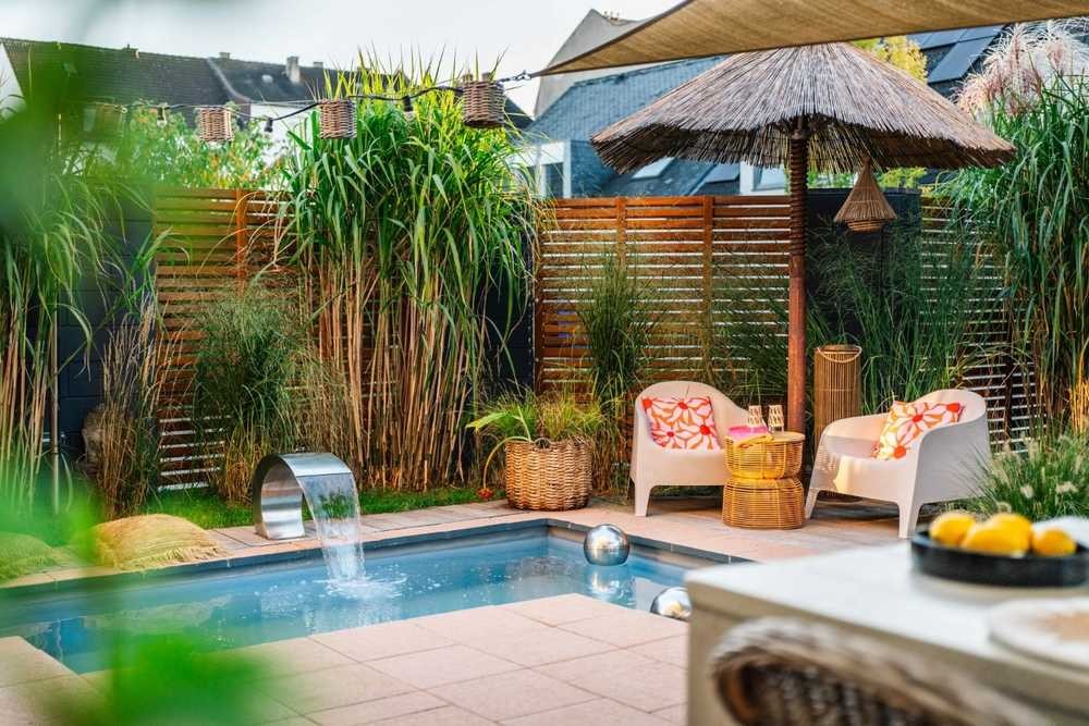 Die Garage öffnet sich, Sie fahren ein, treten aus und sind angekommen. Der offene Wohnbereich empfängt Sie großzügig, die großen Fenster öffnen sich in den Garten, das Wasser plätschert. Ein Ort, der Sie sofort zur Ruhe kommen lässt und zum Entspannen einlädt- nach einem langen Tag. Wie ein Kurzurlaub mit kleinem Pool - ideal zum Abkühlen im Sommer. Gezielte wunderschöne Bepflanzungen und Bäume als Schattenspender, geschützt vor Einblicken, ruhig und grün.
