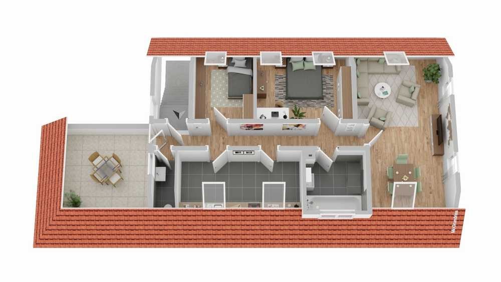 Die Wohnung im DG besteht aus 3 individuellen hellen Zimmern mit Einbauschränken in den Dachschrägen, einem modernisierten Tageslichtbad mit Badewanne und einem separaten WC. Die Küche kann nach eigenen Wünschen ausgestattet und gestaltet werden. Eine große Bühne im Spitzgiebel bietet zudem viel Stauraum.