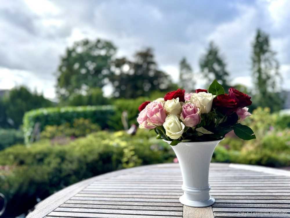 Der nach Süden ausgerichtete Terrassenbereich ist großzügig angelegt und der Garten überzeugt mit regionalem Flair und ist für Kinder oder Hunde sicher eingezäunt.