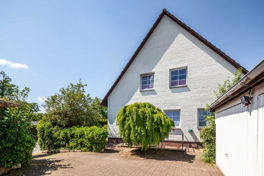 Auffahrt führt zur Doppelgarage mit angeschlossenem Schuppen. Etwas