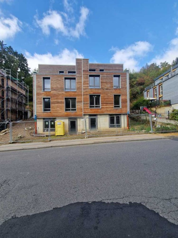 Das Haus ist komplett massiv gebaut, aber sämtliche Fußbodenaufbauten, nicht-tragenden Innenwände, Fassadendämmung und Fassaden-Verkleidung bestehen aus Holz.