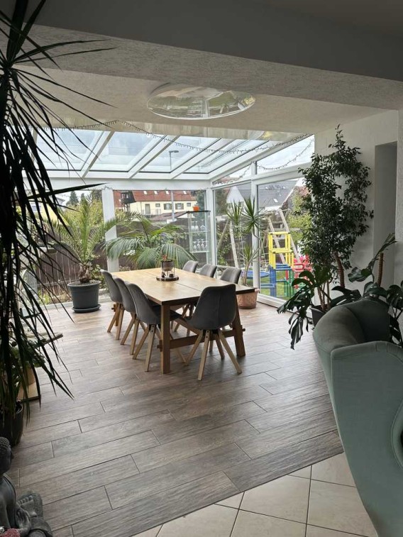 Der Wintergarten im EG ist mit einer Fußbodenheizung und elektrischen Raffstoren ausgestattet.