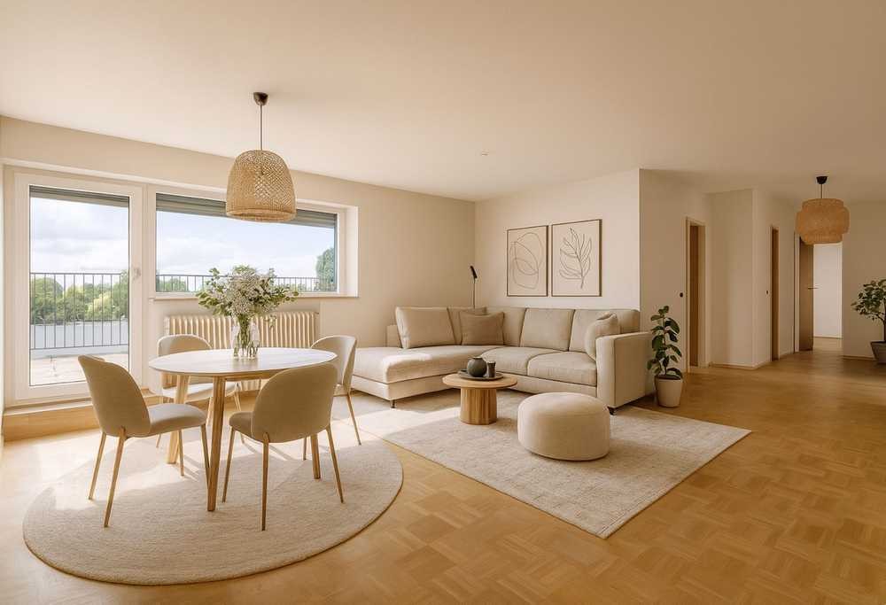 Mit einer Wohnfläche von ca. 79 m² überzeugt die Wohnung durch ihre großzügige Raumaufteilung und ihren ausgeprägten Wohlfühlcharakter. Das Holzparkett verleiht den Wohnräumen eine warme und einladende Atmosphäre. Beim Betreten öffnet sich ein Eingangsbereich, von dem aus der weitläufige Wohn- und Essbereich zugänglich ist – das Herzstück der Immobilie. Große Fensterfronten und eine Terrassentür lassen viel Licht herein und schaffen eine freundliche, helle Stimmung.